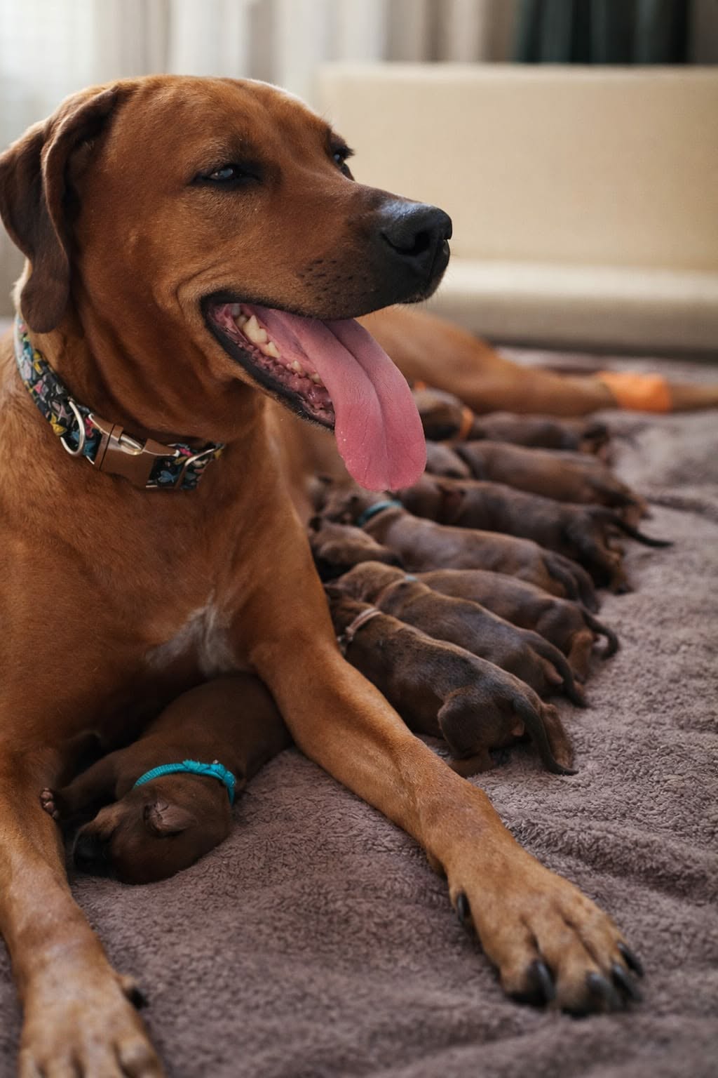 Caitlyn má porod úspěšně za sebou a teď si užívá své role maminky. Je klidná, spokojená a s velkou péčí se stará o svá štěňátka. Všechno proběhlo tak, jak mělo, a teď už u nás vládne jen tiché spokojené vrnění.